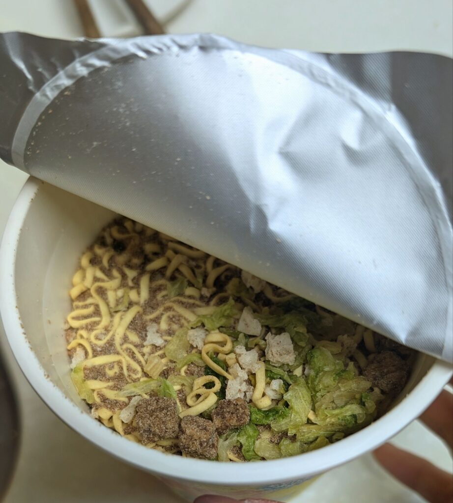中身はいつもカップヌードルに見えますね👀私の見慣れてるカップルヌードル醤油味のようです🙂この時点では特に驚きもなしです🤔