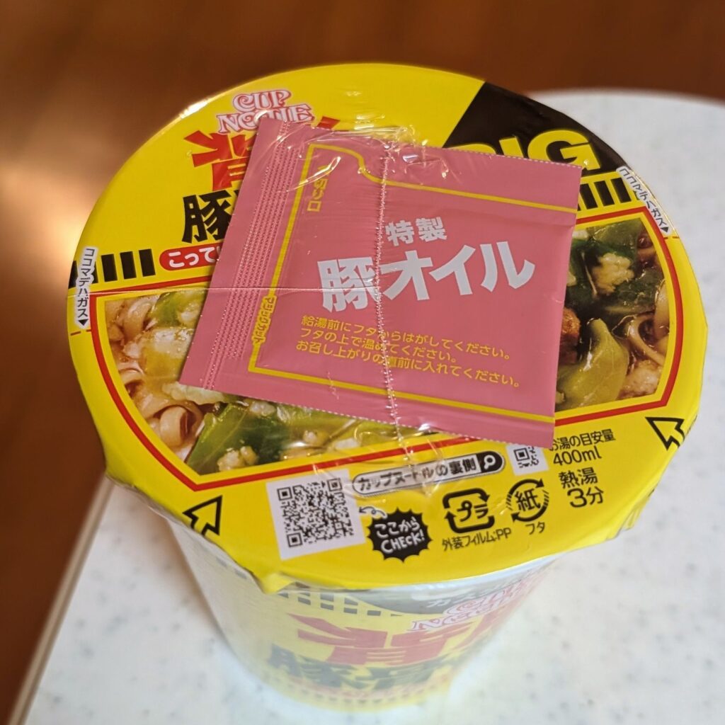 3分経ったら蓋を開けて、付属の特製豚骨オイルを投入します😊(※開封前の写真をしか撮ってなくてごめんさいm(_ _)m)