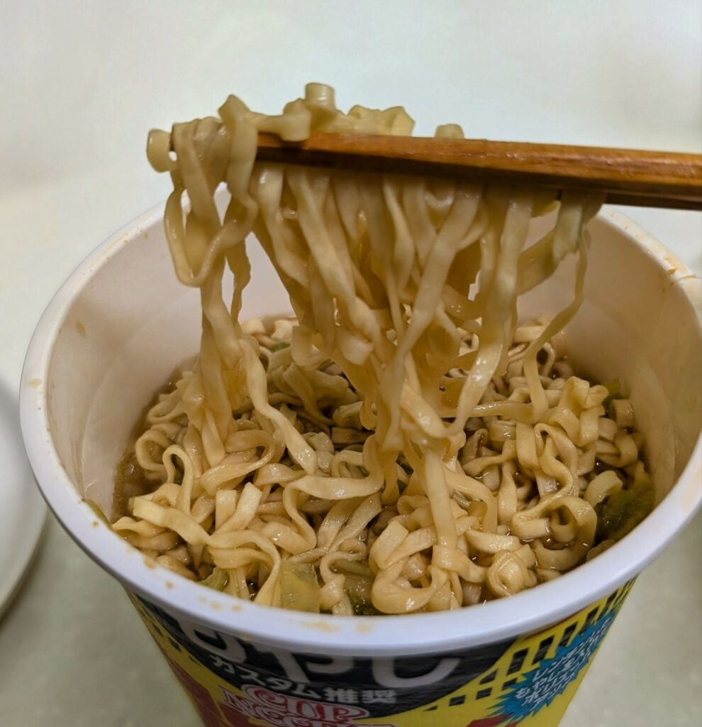 麺はカップヌードルらしいもっちり食感。ただし、この「背脂豚骨醤油」は通常のカップヌードルより少し太めで、濃厚スープによく絡みます🤗