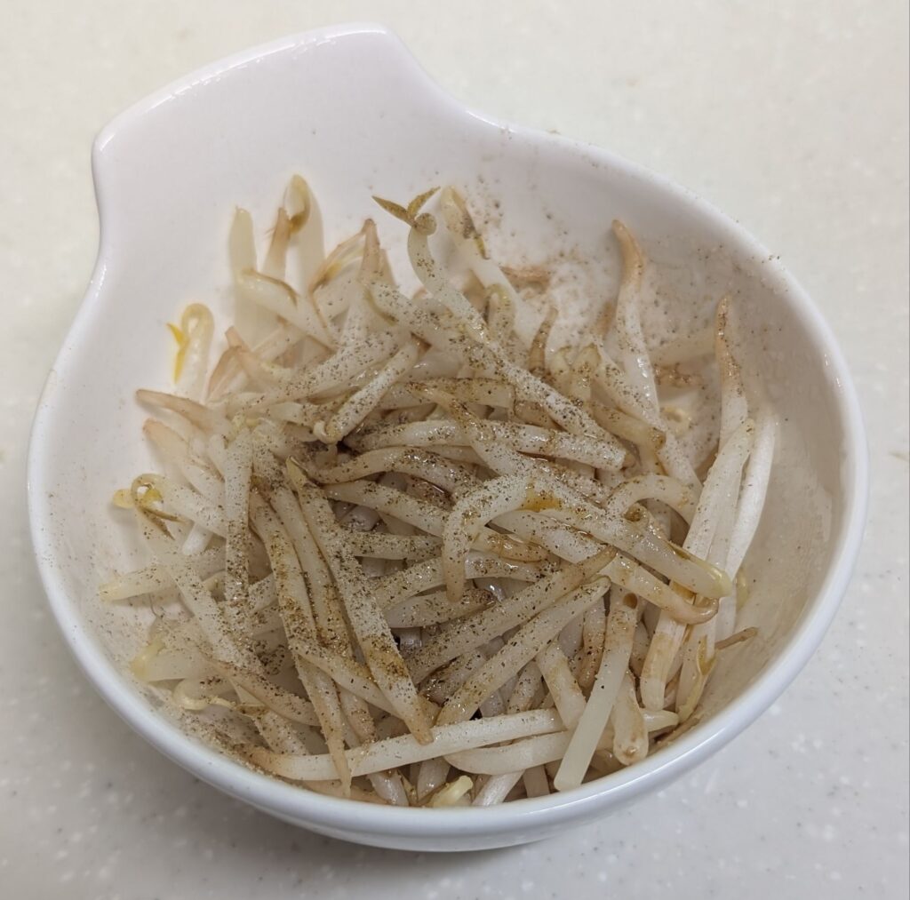 🤗私ははもやしを2つ掴みくらいを耐熱容器に入れて、電子レンジで約2分加熱。(推奨はもやし1パックとかなり多め🤣w)