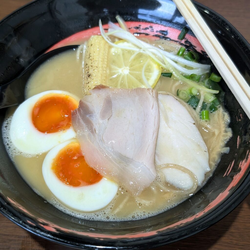 白く濁ったクリーミーなスープの上に、チャーシュー・メンマ・ヤングコーン そしてレモン🍋……トッピングが整然と並んでいて、思わず写真を撮りたくなる美しさです📸