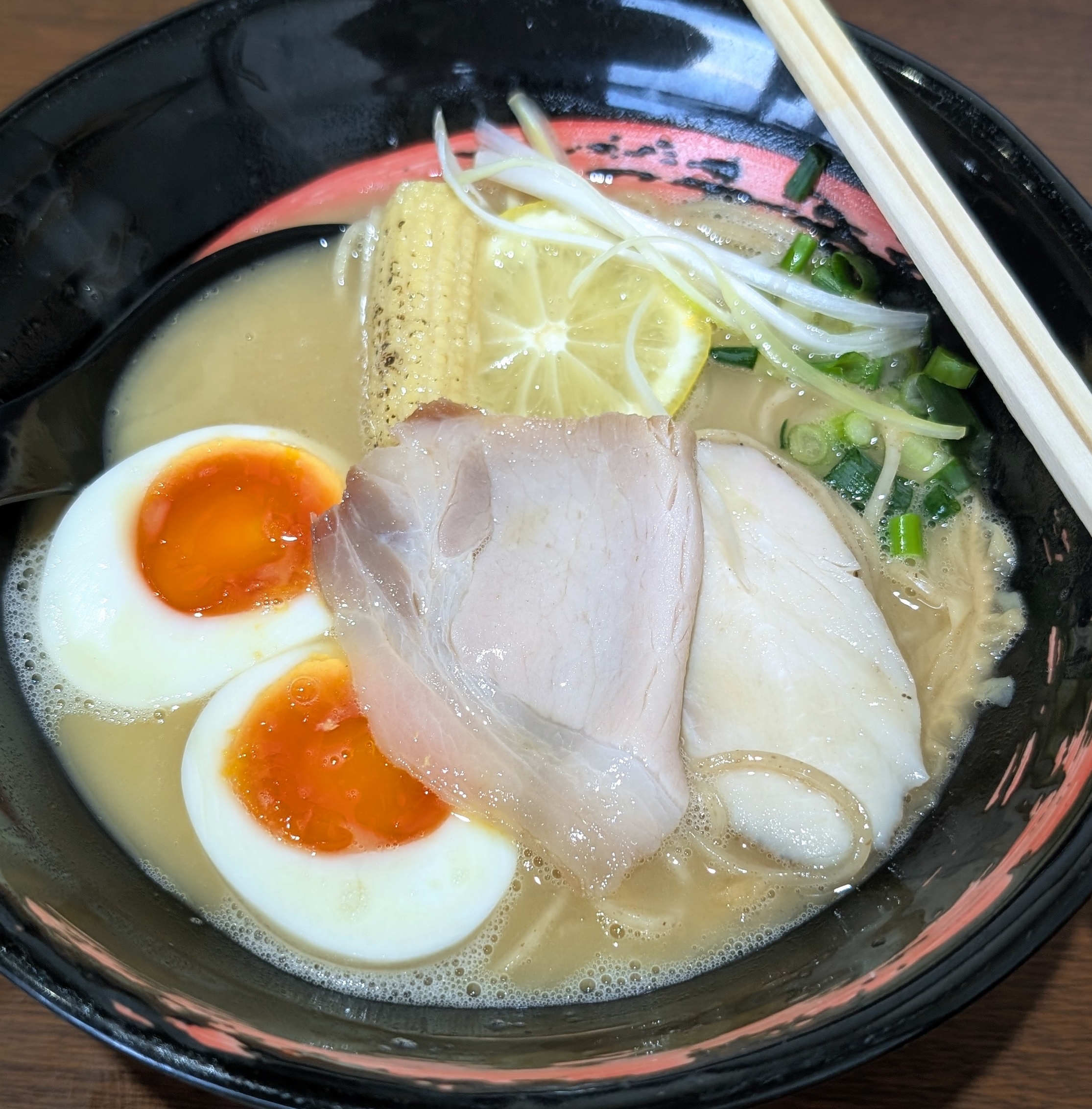 白く濁ったクリーミーなスープの上に、チャーシュー・メンマ・ヤングコーン そしてレモン🍋……トッピングが整然と並んでいて、思わず写真を撮りたくなる美しさです📸