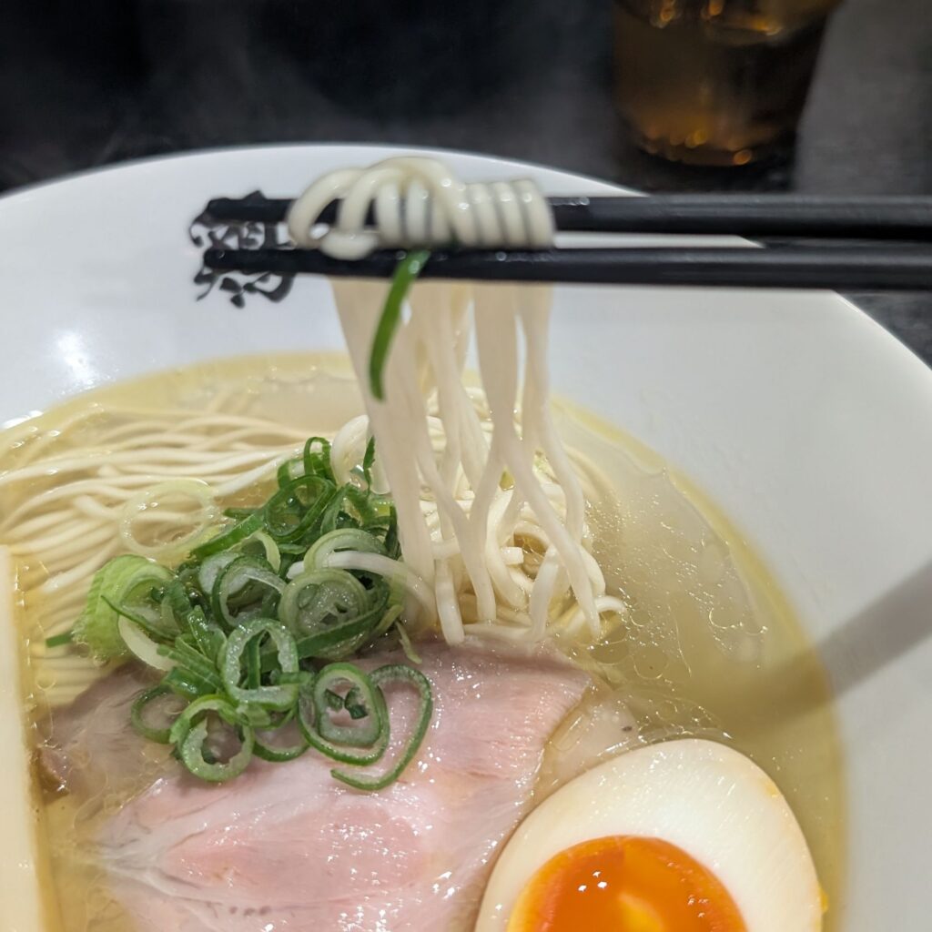 麺は自家製の細麺。箸で持ち上げると、艶やかな白い麺がスープを纏いながらすっと立ち上がります。