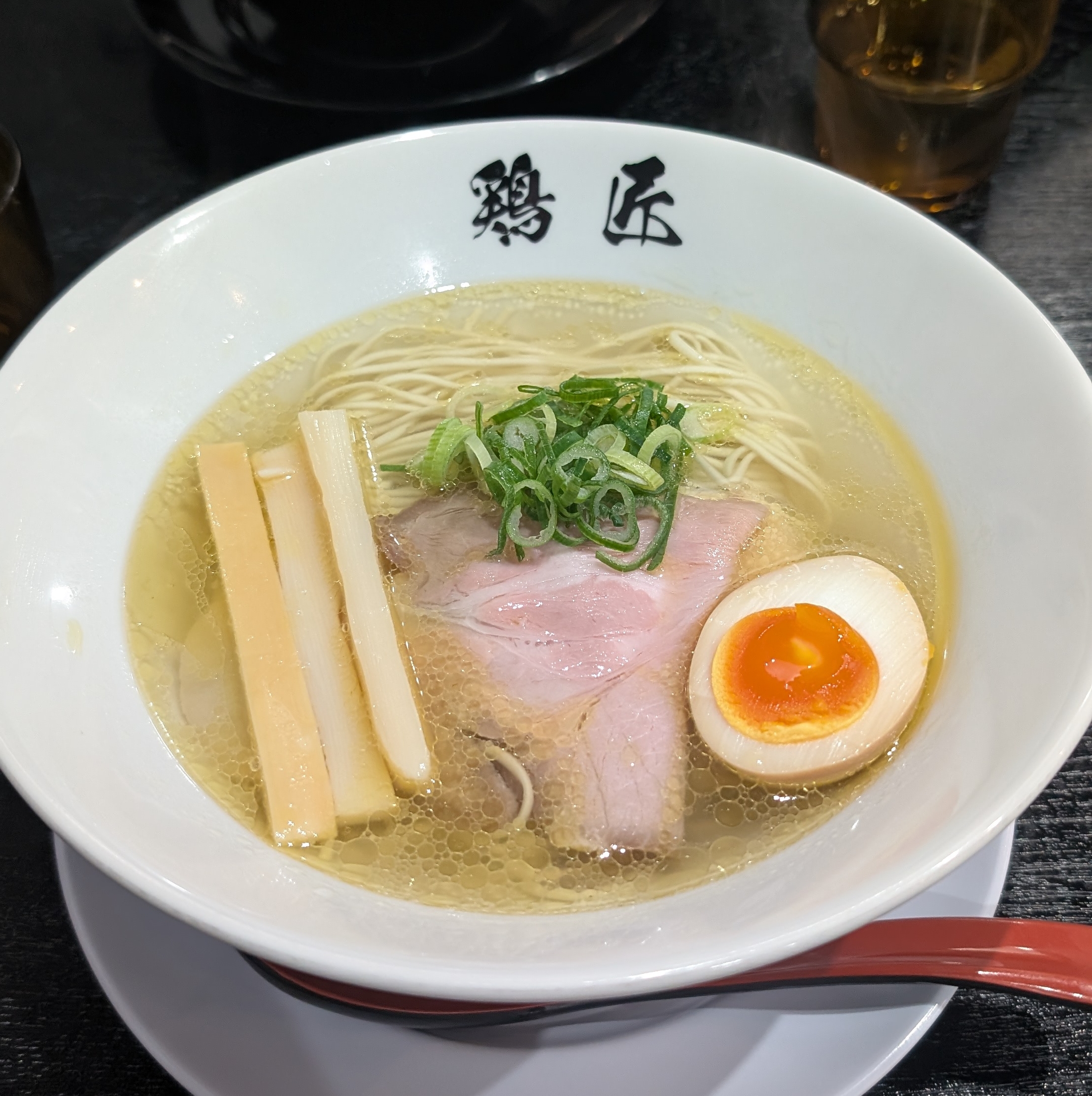 透明感のある黄金色のスープが、店内の照明を受けてキラキラと輝いています😧✨。この色合いだけで、丁寧に取られた鶏の旨味がぎゅっと詰まっていることが伝わってきます。