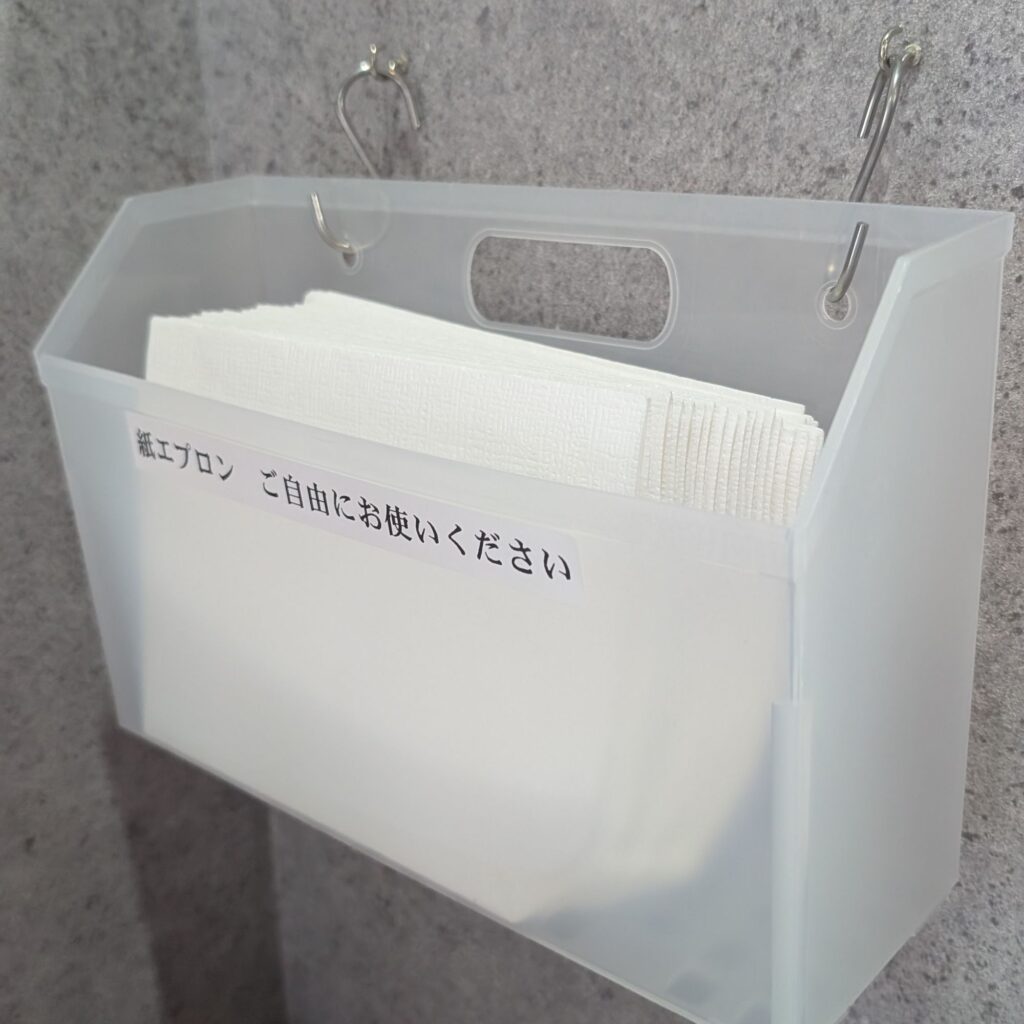 そして、券売機すぐ横には紙エプロンが用意されているという気配りも👏これは女性には嬉しいアメニティですね😊